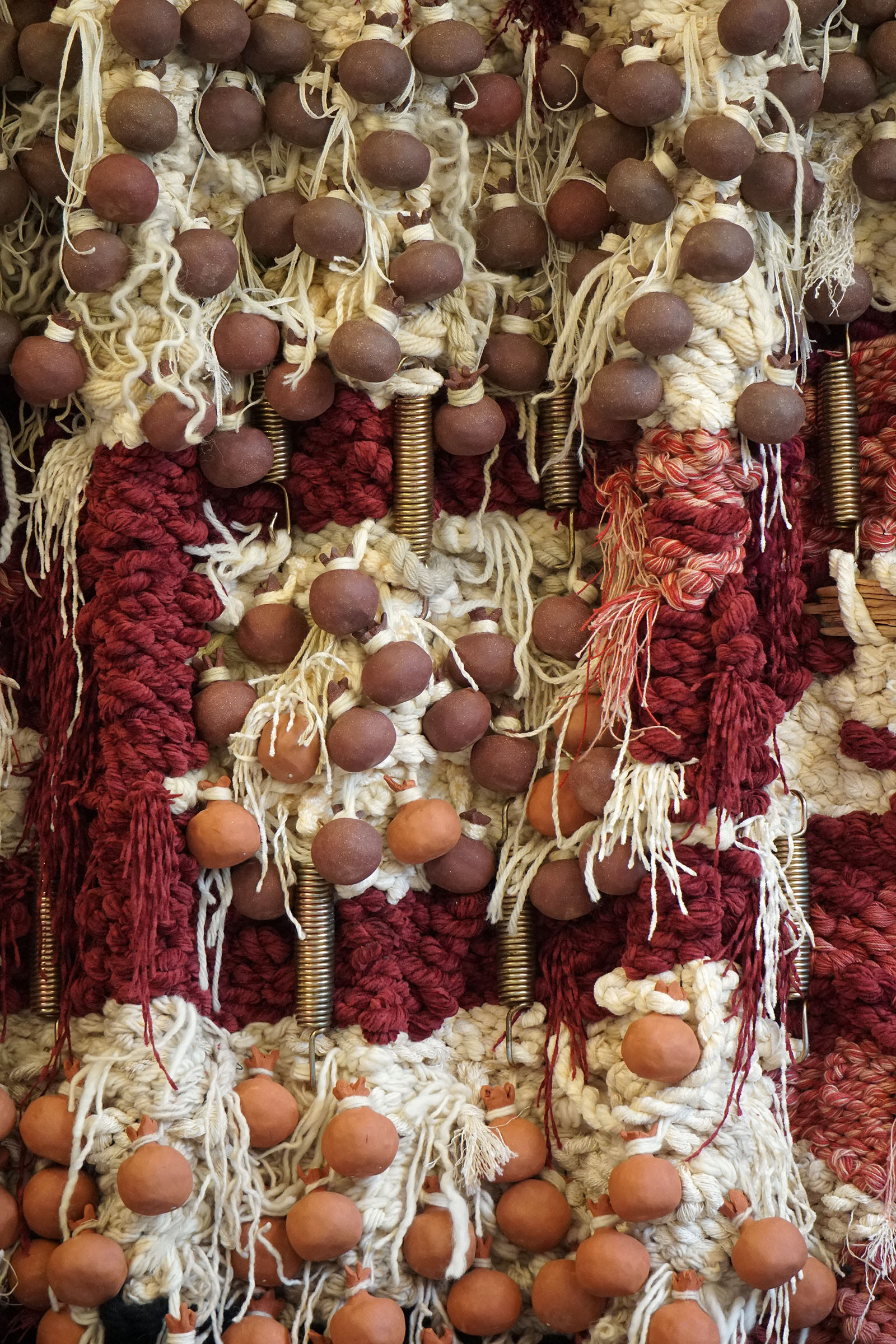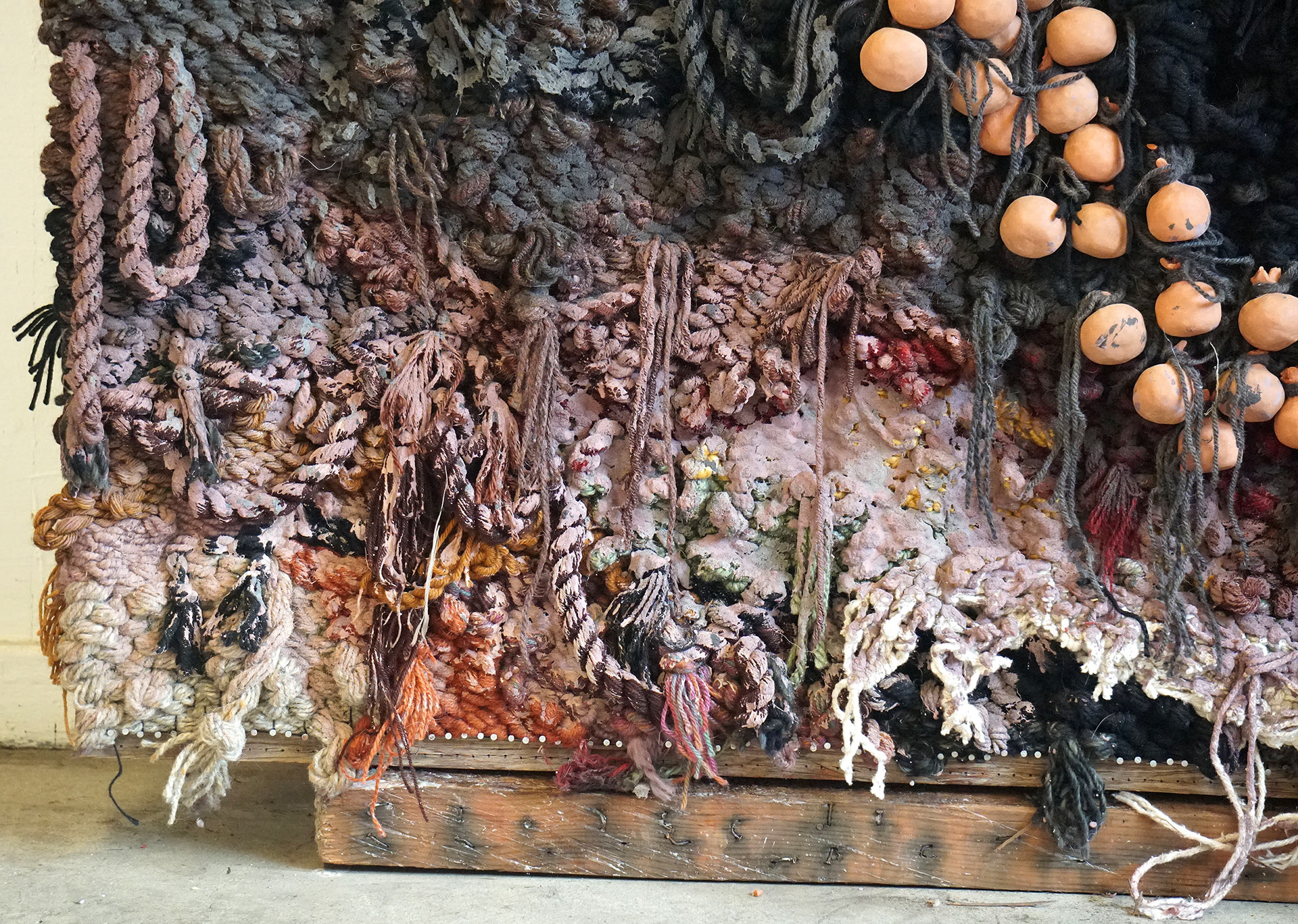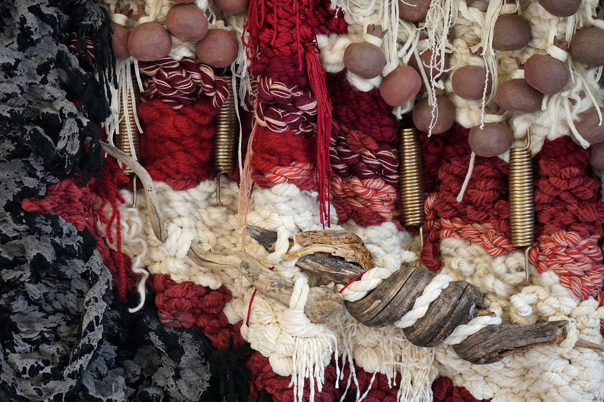 twisted, woven cord, clay pomegranates, driftwood, found springs